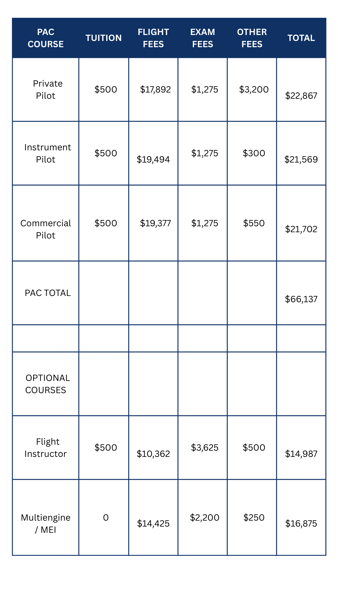 PAC COURSE | TUITION | FLIGHT FEES | EXAM FEES | OTHER FEES | TOTAL |